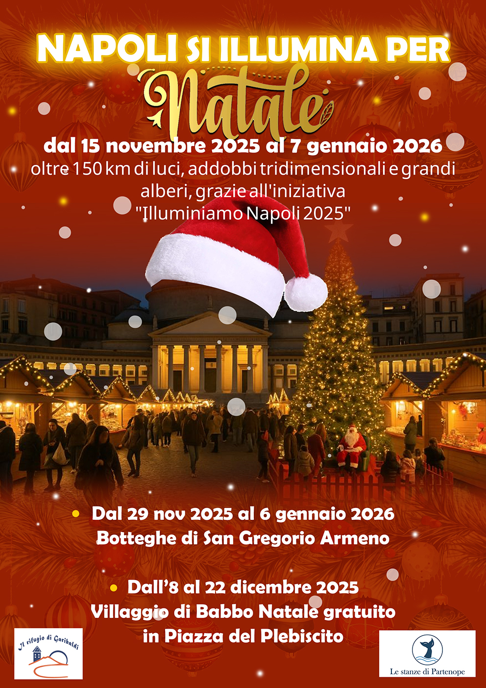 - Luminarie Natalizie: L'iniziativa "Illuminiamo Napoli 2025", finanziata da Comune e Camera di Commercio, prevede l'installazione di oltre 150 km di luci, addobbi tridimensionali e grandi alberi in diverse zone, tra cui Piazza Municipio, Piazza Garibaldi, il Vomero, Chiaia e Fuorigrotta. L'accensione ufficiale è prevista per il fine settimana del 15 e 16 novembre 2025 e le luci rimarranno attive fino al 7 gennaio 2026.